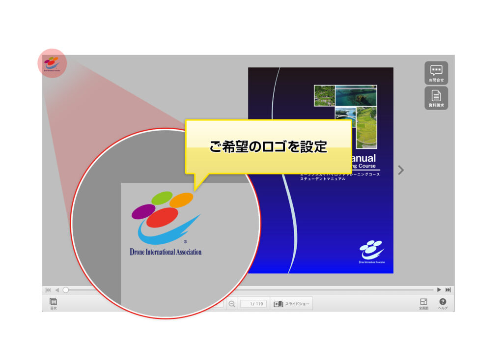 ビューア内にご希望のロゴを設置します。ロゴから外部ページへ移動するリンク設定が可能です。gifアニメーションもご利用いただけます。