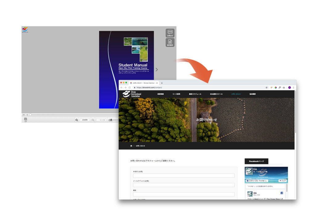 電子ブックの開いているページに対応した商品詳細ページ、または購入ページへ移動できるカートボタンを設置します。自社ECサイトへの送客に役立ちます。