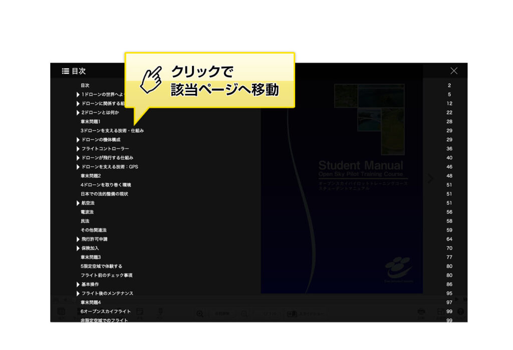 目次を一覧表示し、目次から該当ページへ移動できるようになります。ご入稿用のPDFにしおり設定がされている場合は、自動で抽出されます。