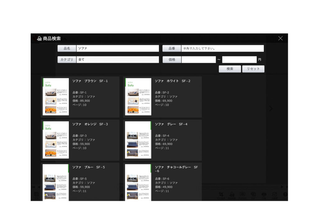 電子ブックに掲載されている商品を「品名」「品番」「カテゴリ」「価格」の条件から検索し、該当ページへ移動できるようになります。